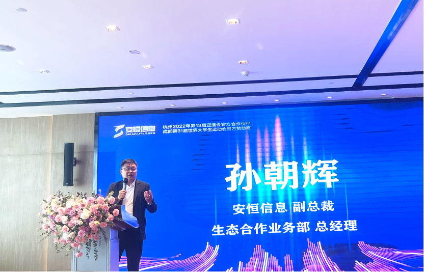 安恒信息副总裁、生态合作业务部总经理孙朝辉发表致辞,孙朝辉以“恒变、恒易”为开场词,阐述了安恒信息持续变革的恒心,对渠道服务不变的初心,以及让一切合作更为容易的决心。