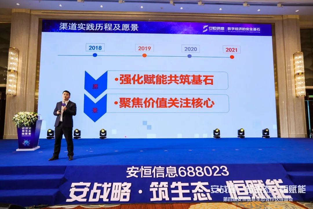 安恒信息副总裁&生态合作业务中心总经理罗贤斌向参会嘉宾全面解读2021年安恒信息渠道合作政策,阐明安恒信息将渠道事业部升级为生态合作业务中心深刻内涵,对渠道结构体系完善、聚焦优质伙伴、渠道政策亮点、渠道产品亮点、渠道百城活动、立体赋能等方面进行了全面阐述。安恒信息将构建公平公正公开透明的渠道体系,不断优化组织架构、考核体系和系统流程,更加开放地拥抱合作伙伴,吸纳不同类型的伙伴共谋发展,携手奋进推动生态合作的深入,通过各项改革措施支撑渠道战略落地执行。