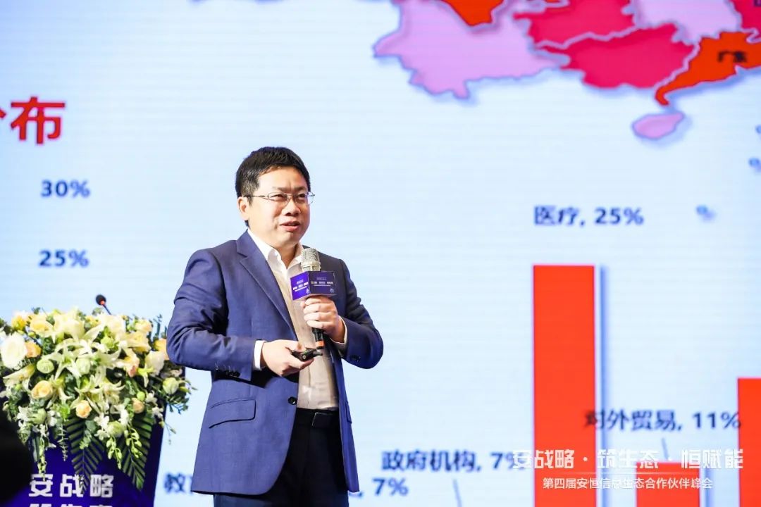 安恒信息副总裁林明峰梳理网络安全行业的新趋势和新思路以及教育医疗企业的行业特点,结合安恒丰富的产品线和技术特征分享了安恒信息在这些领域的独特打法,从更高维度助力合作伙伴在这些传统优势领域充分发挥自身资源实现业务上的稳健增长,赢得了与会嘉宾的充分共鸣。