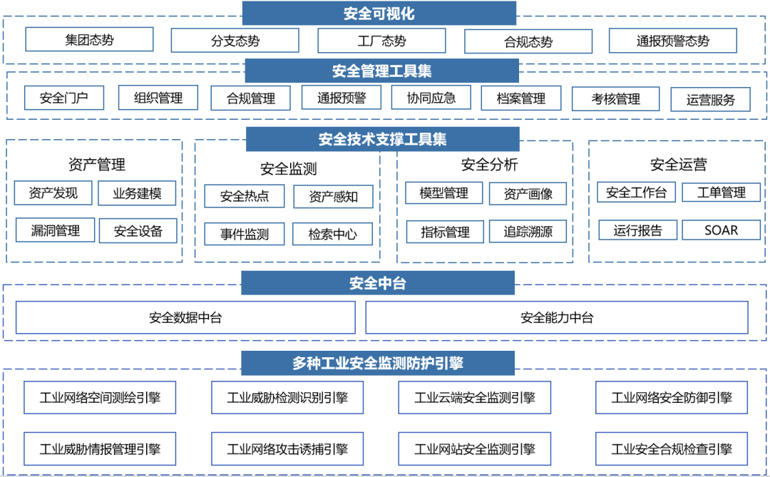 安全引擎层为平台运行提供必要的基础安全能力和数据来源,包括工业网络资产测绘引擎、工业威胁检测识别引擎、工业网络攻击诱捕引擎、工业网络防御引擎、工业威胁情报管理引擎等。