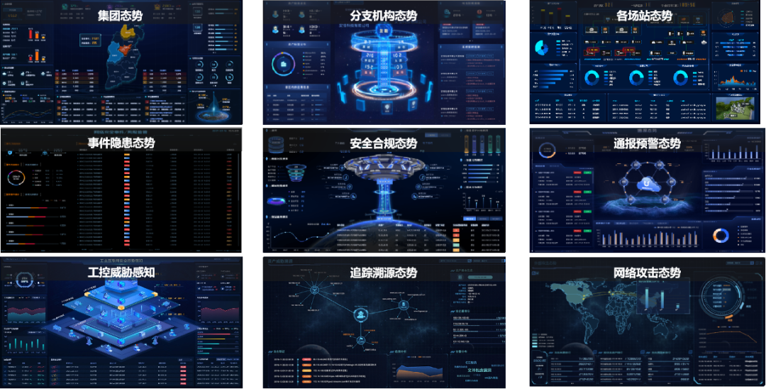 态势感知模块以可视化应用的方式对该汽车制造集团态势进行展示,组建两网(工控网、管理信息网)融合态势感知大屏。
