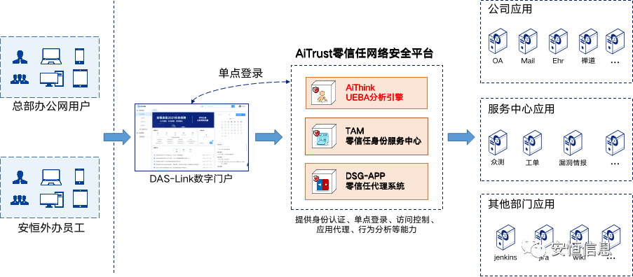 AiTrust解决方案一期项目可对接公司DASLink、上网认证、OA、Mail、禅道、销售易等30+应用系统,于2021年12月31日正式上线,首日活跃用户2000+人。