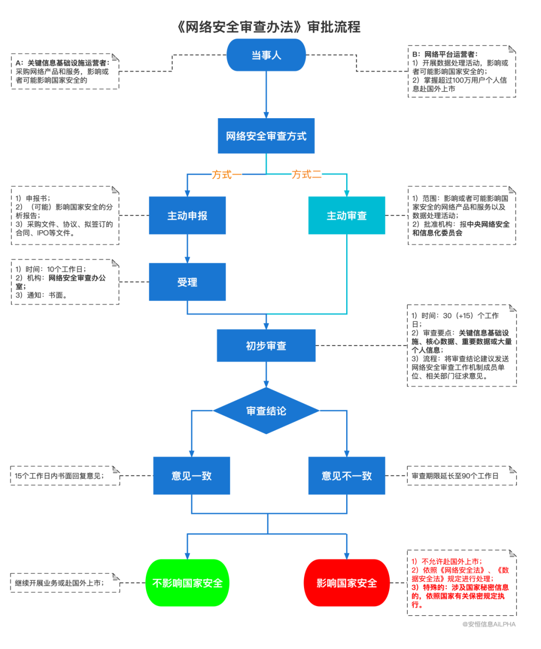 《办法》关于关于审查程序和内容方面,延长了特别审查程序的审查时间,增加了核心数据、重要数据或者大量个人信息、上市企业关键信息基础设施等角度。具体的审查工作流程和期限如图。
