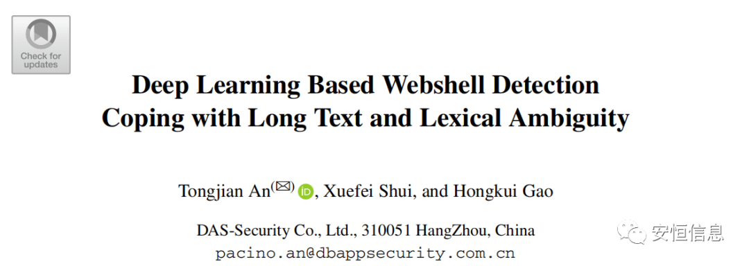 近日,安恒信息中央研究院安通鉴博士带领的AI安全团队针对网络攻防场景的基于深度学习的webshell检测的研究成果“Deep Learning Based Webshell Detection Coping with Long Text and Lexical Ambiguity”,被高等级国际学术会议ICICS International Conference on Information and Communications Security 2022(隶属中国计算机学会推荐国际学术会议和期刊目录)收录并在线发表。