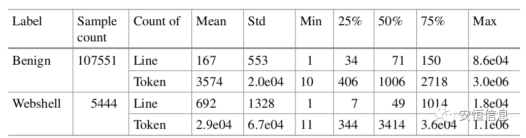 长文本在webshell检测领域是频繁出现的,对已知webshell和正常样本的代码行数和token数统计,一半以上的webshell代码token个数超过3400,代码行数超过49行,而一半以上的正常代码token个数超过1000,代码行数超过70. 所以需要合适的方法在保留核心语义的同时去除冗余信息。