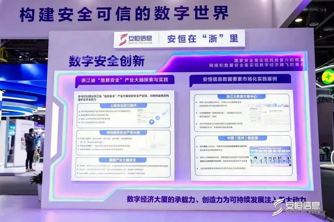 首届数贸会由浙江省人民政府和商务部联合主办,杭州市人民政府、浙江省商务厅和商务部贸发局共同承办。安恒信息深度参与本届数贸会,以“筑牢数字化安全根基”为主题,在数字品牌馆、数字消费馆和综合馆三大展馆全面开花,展示我们在“浙”里的创新成果,在数据安全、安全运营服务、终端安全的行业实践,在威胁情报、科技反诈的前沿探索,以及智慧城市和国家重大赛事网络安保案例,多角度多维度呈现安恒信息在数据安全治理、安全场景赋能、企业数字化改革等方面的综合实力。