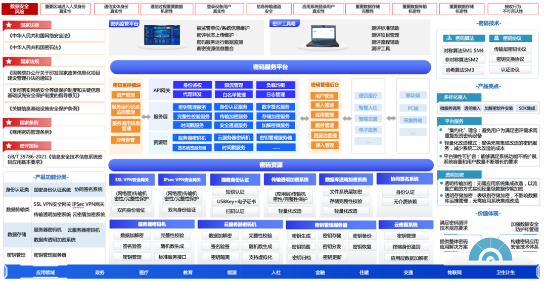 围绕密评标准、打造以密码服务平台与监管平台为支撑的国密产品体系;助力客户高分通过密评;打通密码服务平台与各产品的联动、可管、可检测、可监管。