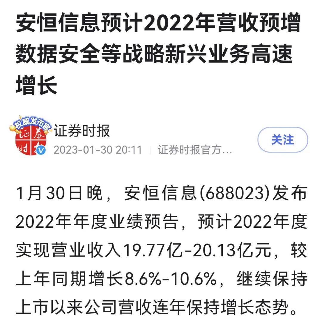 1月30日晚,安恒信息(688023)发布2022年年度业绩预告,证券时报同步进行报道:预计2022年度实现营业收入19.77亿-20.13亿元,较上年同期增长8.6%-10.6%,继续保持上市以来公司营收连年保持增长态势。