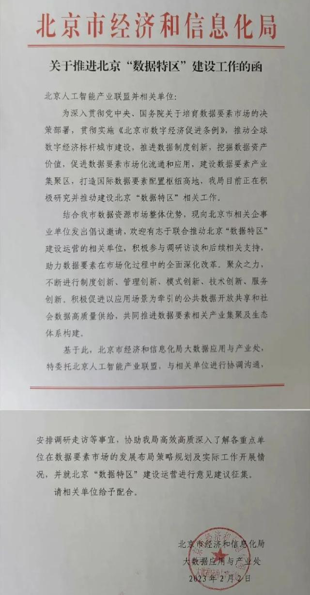 北京市经济和信息化局发布关于推进北京“数据特区”建设工作的函,提出推进数据制度创新,挖掘数据资产价值,促进数据要素市场化流通和应用,建设数据要素产业集聚区,打造国际数据要素配置枢纽高地。