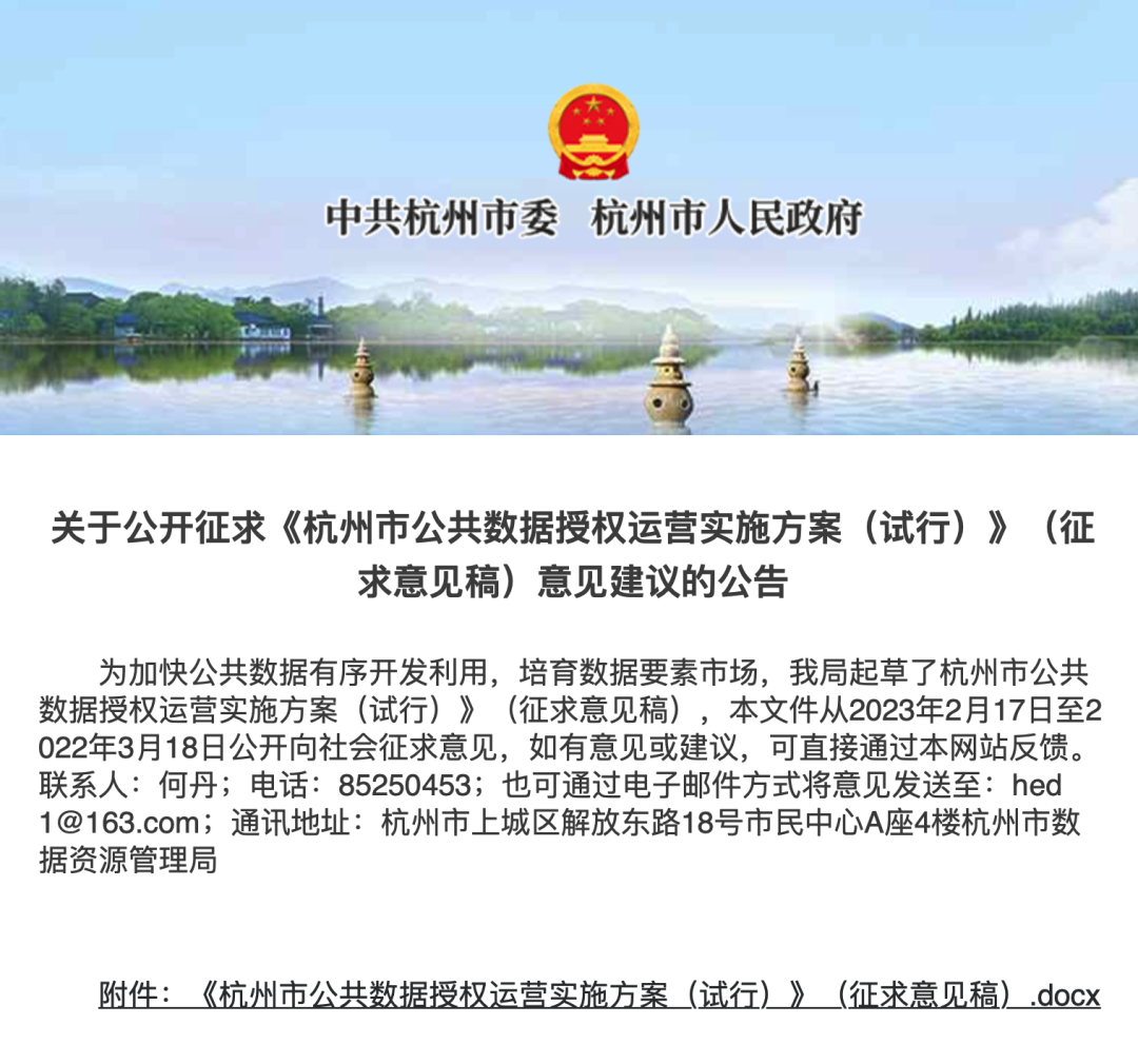 2023年2月17日,杭州市数据资源局通过政府官网发布了 《杭州市公共数据授权运营实施方案(试行)》(征求意见稿),公开向社会征求意见。