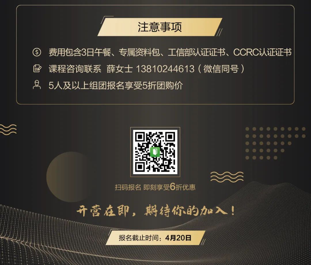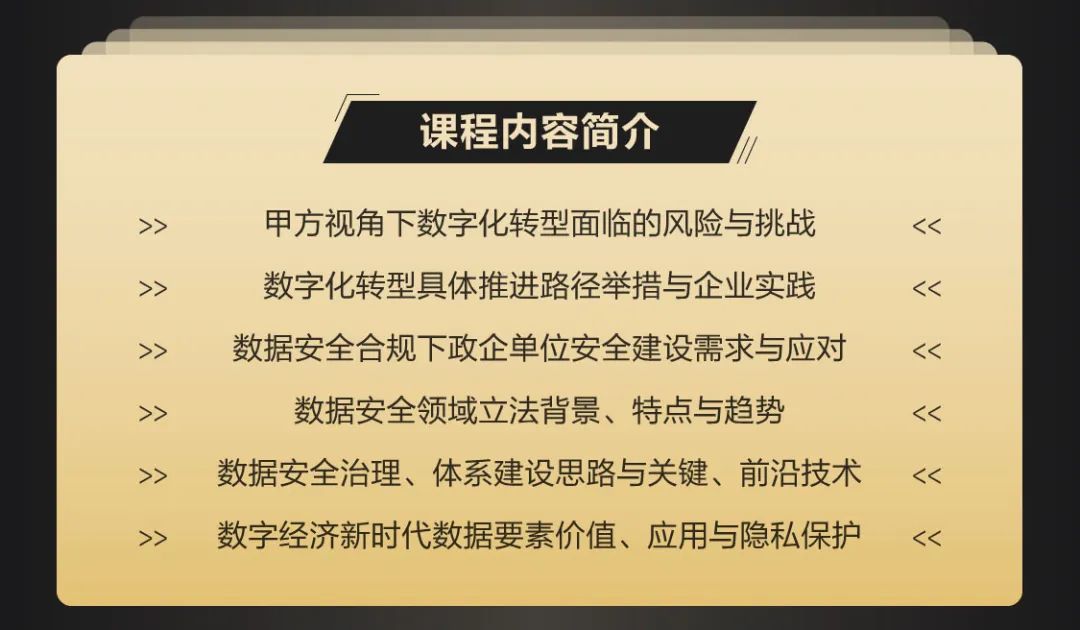数字安全官高级研修班课程框架包括5大主题,10块课程安排,培训对象为党政军企网络安全工作的主管领导或主要负责人,旨在提升他们的网络安全建设战略思路与实践能力,限制30人。所有授课结束后将进行学员交流分享+讲师点评并做评优。此外,还会建立学员交流群,讲师入群,随时互动。