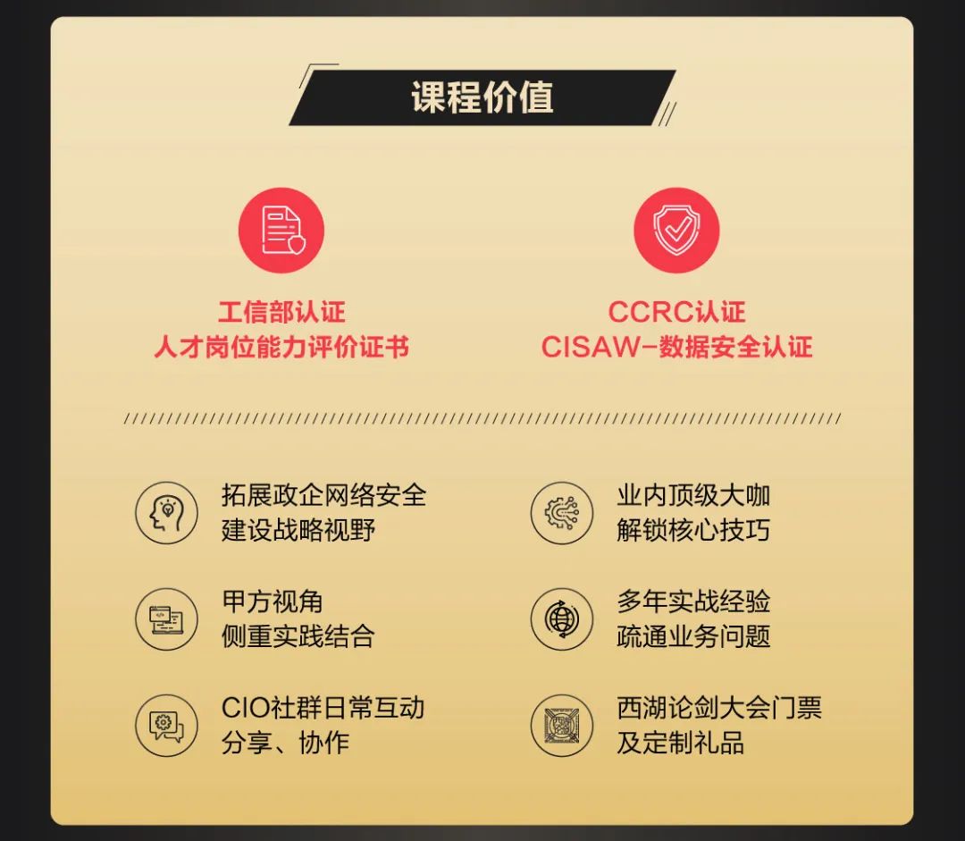 西湖论剑安全特训营在2023年西湖论剑·网络安全大会期间将通过线下授课方式开展场景化培训。你可能学过很多的CSO理论,但从来没有见过这么多的实战干货;你可能参加过很多的CSO培训,但从来没有见过如此完整的CSO路径;你可能认识很多CSO的朋友,但从来没有听过这么掏心掏肺的分享。在数字时代下,我们赋予CSO全新定义“数字安全官”。首期数字安全官高级研修班3天课程惊艳来袭。