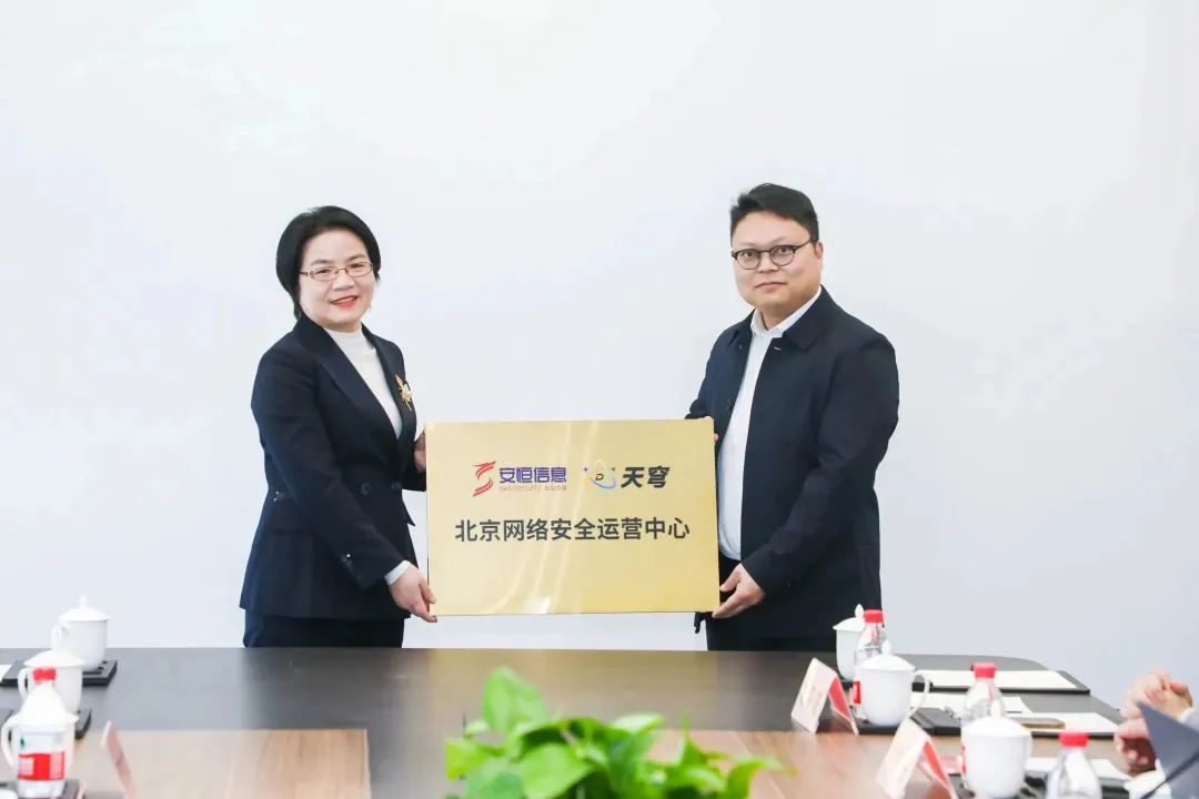 会上,海淀区委宣传部常务副部长、区委网信办主任黄英,安恒信息首席安全官、高级副总裁袁明坤为安恒信息“天穹”北京网络安全运营中心揭牌。同时,北京航空航天大学网络空间安全学院院长刘建伟和安恒信息北京公司总经理、高级副总裁赵万国共同签署了“北航-安恒信息大数据与人工智能安全联合实验室”合作签约。