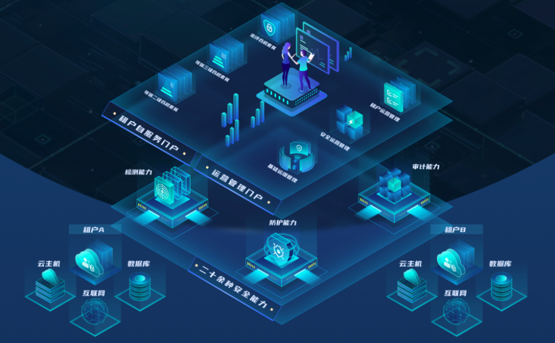 安恒云-天池云安全管理平台创新性的本地SaaS模式向政务云租户提供安全能力。除了基础的等保合规类能力外,同时包括了数据安全类、密评合规类、攻防实战类等共计20余种安全能力,充分满足全国一体化大数据体系的多样化安全需求。同时支持建设技术、人员、流程相结合的云上安全运营中心,打造有效、主动、闭环的云上安全运营体系。