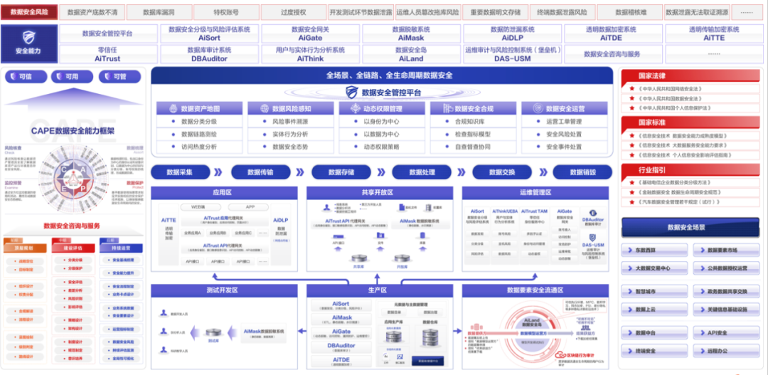 安恒数盾数据安全解决方案适用全国一体化大数据体系数据安全保障的采集、传输、存储、处理、交换等各类场景。我们认为数据安全安全保障需要从访问、数据、基础设施综合设计。数据安全保障体系可结合整个零信任体系,结合数据安全的全流程管控、追溯体系,结合数据安全的动态行为分析,结合数据安全的加密和保护,结合数据安全的全流程CAPE数据安全能力框架,结合数据安全规划设计,让它系统性、全流程、平台化和全场景进行实时防护。安恒信息集成了体系化的政府数字化转型的安全经验,真正能够在可信、可用、可管、可溯源的体系中保障数据全场景、全链路、全生命周期的安全,以及实现数据的可用不可见、可用不可取,为全国一体化政务大数据进行赋能,激活数据潜能,释放数据价值。