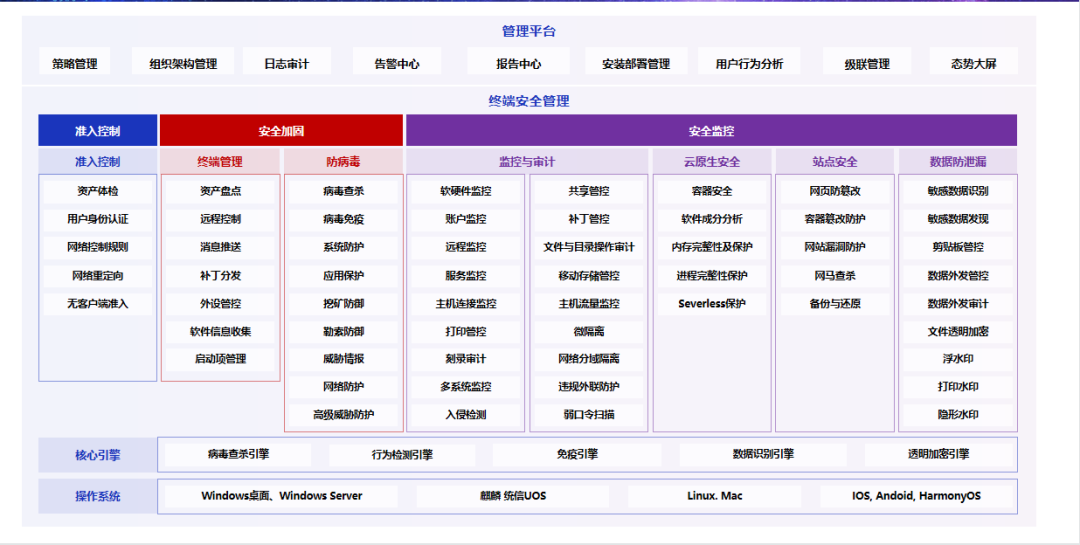 主机监控与审计能力:以主机管理为核心,形成集主机监控与审计、补丁管理、运维管理等为一体的主机审计系统,为企业管理者提供内网主机统一管理解决方案,最大程度杜绝终端违规操作,帮助使用者创建一个安全、可靠、稳定、合规的内网办公环境。