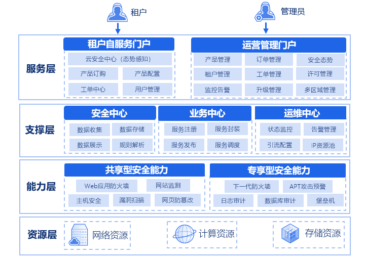 基于在云计算领域多年的深入研究和行业特性分析,以及对网络安全领域的技术经验积累,安恒信息推出“安恒云”云计算及安全管理平台(简称“安恒云”)。安恒云集多云安全能力中台、多云安全运营中心和多云资产安全运维于一体,针对多样化的云计算场景,通过多云安全管理平台统一接管各类云平台,实现多云资产的全生命周期管理。同时,多云安全中心融合了安恒云安全能力及第三方合作伙伴安全能力,实现安全能力资源化,安全资源服务化,多云安全中心为各类云平台量身打造整体的综合性安全能力,解决用户上云过程中面临的安全风险和难题,提供一站式综合云安全解决方案,为云上业务保驾护航。