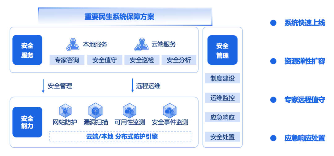 安恒信息在线订阅式SaaS服务针对重要民生系统可能存在的短时间内高并发的业务特性以及节假日等关键时间支撑人手不足的实际情况,推出重要民生系统保障方案,通过云端分布式技术架构的防护能力,结合7*24小时远程安全服务以及全流程的服务跟踪,给予用户全方位的安全保障。