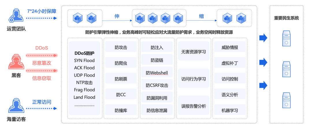 重要民生系统保障方案采用先进的SaaS化技术,主动出击,持续地监测系统状态,从容应对各类潜在的安全威胁和高并发访问,保障重要民生系统安全稳定运行。
