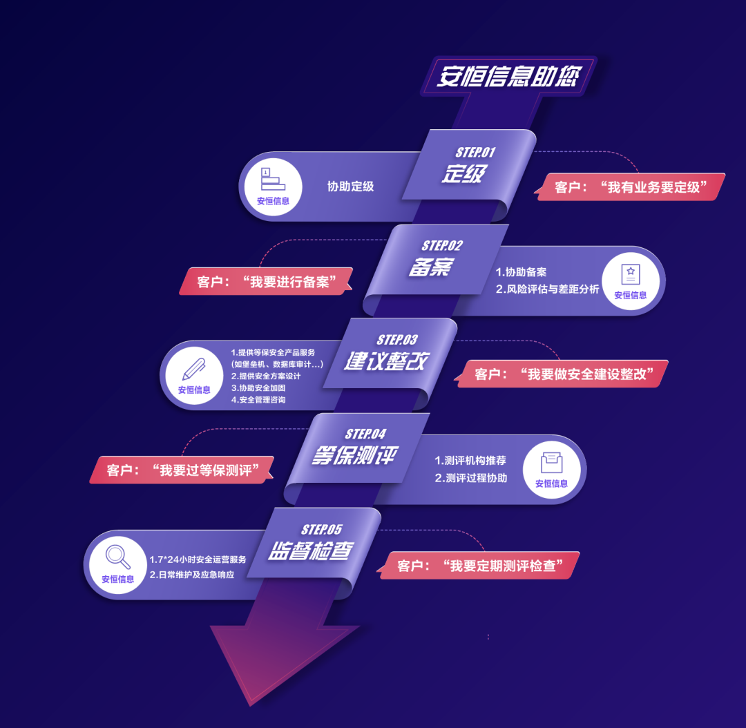 建议整改阶段:从安全方案的设计到实施加固,安恒信息都将全程参与,并为客户提供等保二级套餐和等保三级套餐,包含云安全管理中心、下一代防火墙、WAF等十余款安全能力产品,实现“拎包入住”。