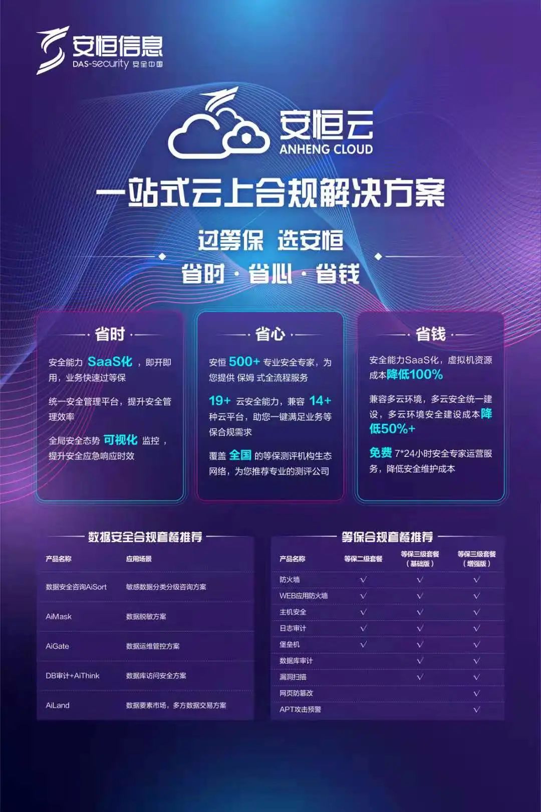 郑赳表示,随着《网络安全法》、《数据安全法》的相继出台,等保2.0时代已经到来,等保合规成为企业运营的必经之路,尤其是如金融、医疗、教育等重点行业,如何更加高效平稳的通过等保2.0,将安全能力转化为自身的发展助力,是安恒信息一直以来致力于促成的结果。针对云上等保合规,安恒信息提供一站式服务闭环,从系统定级、系统备案、安全建设、等保测评到定期安全检查,打造保姆式服务方案。
