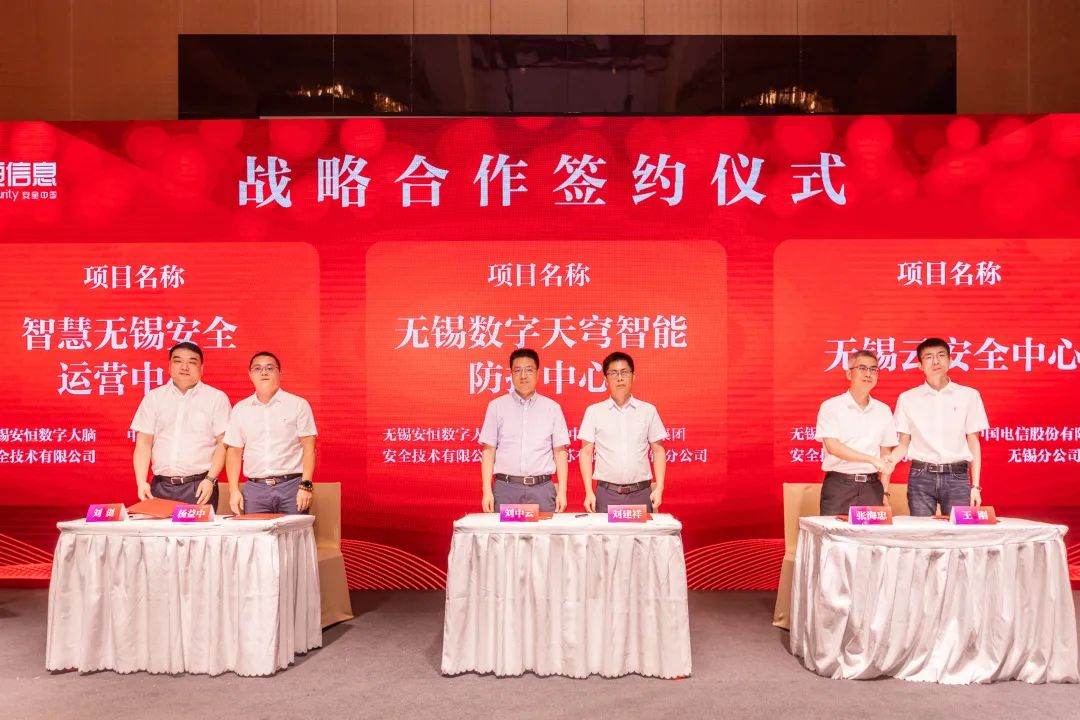 ▲ 安恒信息区域总部分别与中国联合通信有限公司无锡分公司、中国移动通信集团江苏有限公司无锡分公司、中国电信股份有限公司无锡分公司签署战略合作协议