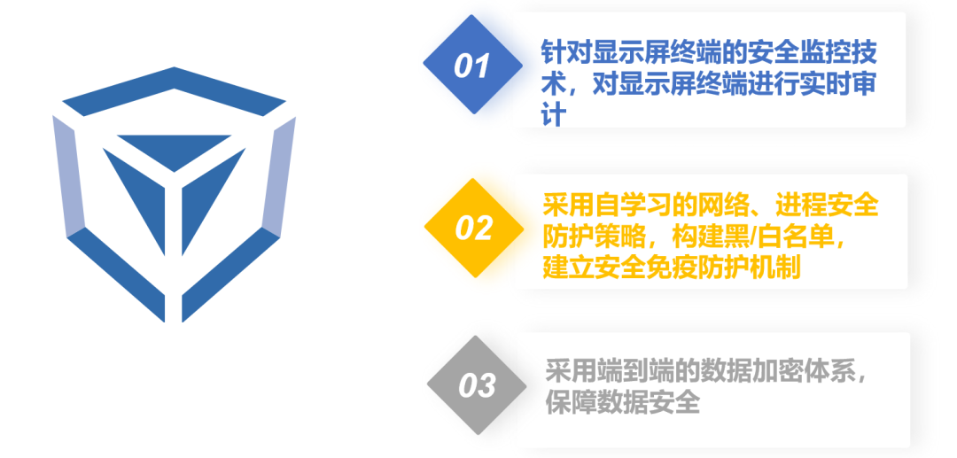 针对显示屏终端的安全防护,基于嵌入式安全自防护与云端态势感知智能分析结合的防护技术,为显示屏终端提供系统监控和防护,通过内核级系统网络、进程和文件监控防护以及专用的数据加密算法,为显示屏终端提供多维度立体化的安全防护方案 。