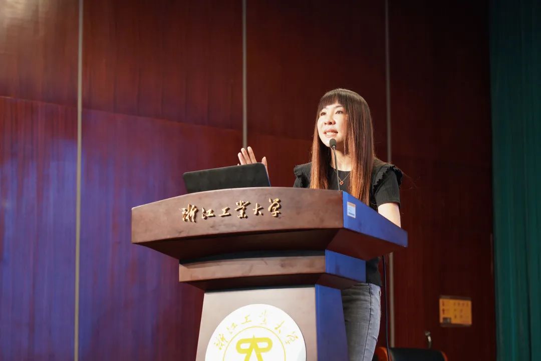 在极具中国传统建筑特色的大讲堂内,首先由浙江工业大学计算机学院党委副书记、纪委书记毛诗焙老师发表欢迎致辞。她介绍了浙工大近年来的发展情况,并通过此次杭州亚组委宣讲团进校宣讲活动,展现安恒信息与浙工大积极响应杭州亚运会“绿色、智能、节俭、文明”的办赛理念,贡献企业的力量,希望在座的各位同学,能认真聆听亚运知识,近距离地感受到杭州亚运会、亚残运会的魅力,并且贡献专业力量,积极参与实践,努力成为亚运网络安全卫士,助力亚运梦想,传递亚运精神,传播公益文化。