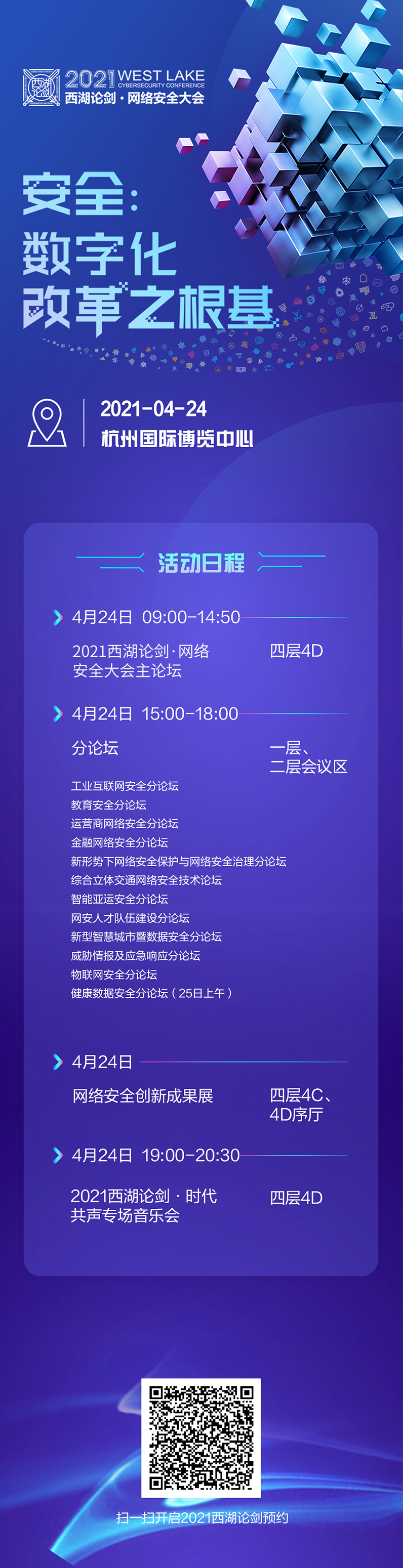 “十四五”开局之际,作为2021年国内首场大型标志性网络安全线下大会,紧抓数字化改革重要历史进程,围绕“安全:数字化改革之根基”这一主题,设立一场主论坛、十二场分论坛和一场网络安全展览。大会将于4月24日在杭州国际博览中心举行,届时将进行线上同步直播。
