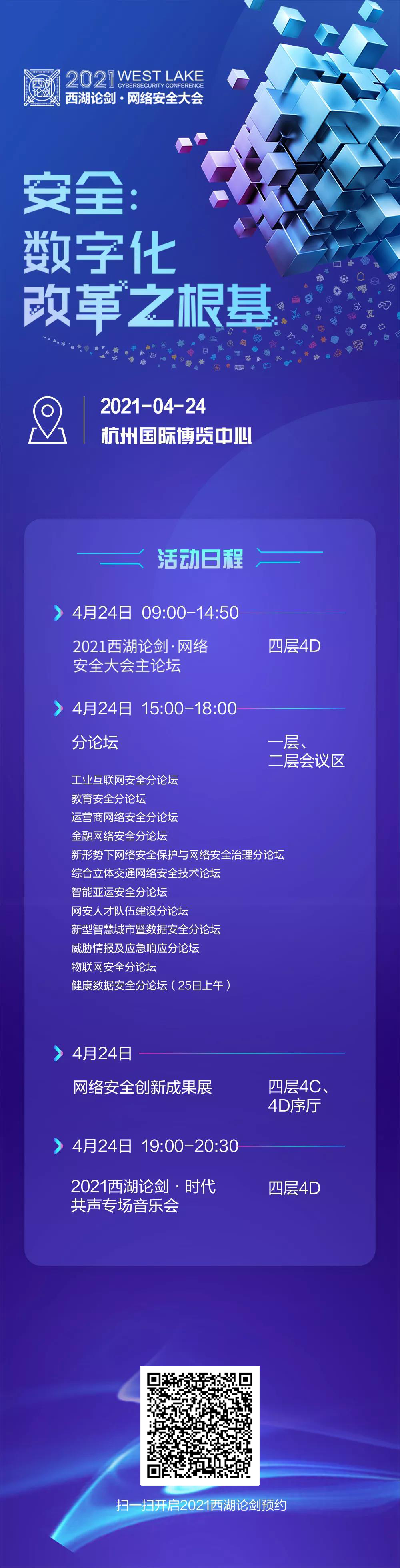 2021西湖论剑·网络安全大会在数字化改革的背景下顺势而为,就网络安全领域的种种问题,邀请多位院士及行业专家深入探讨。大会将设立一个主论坛、十二个分论坛和一场网络安全展览,其中涉及社会民生、行业经济和国内国际多个安全领域的热门话题,旨在为数字化改革奠定安全根基。
