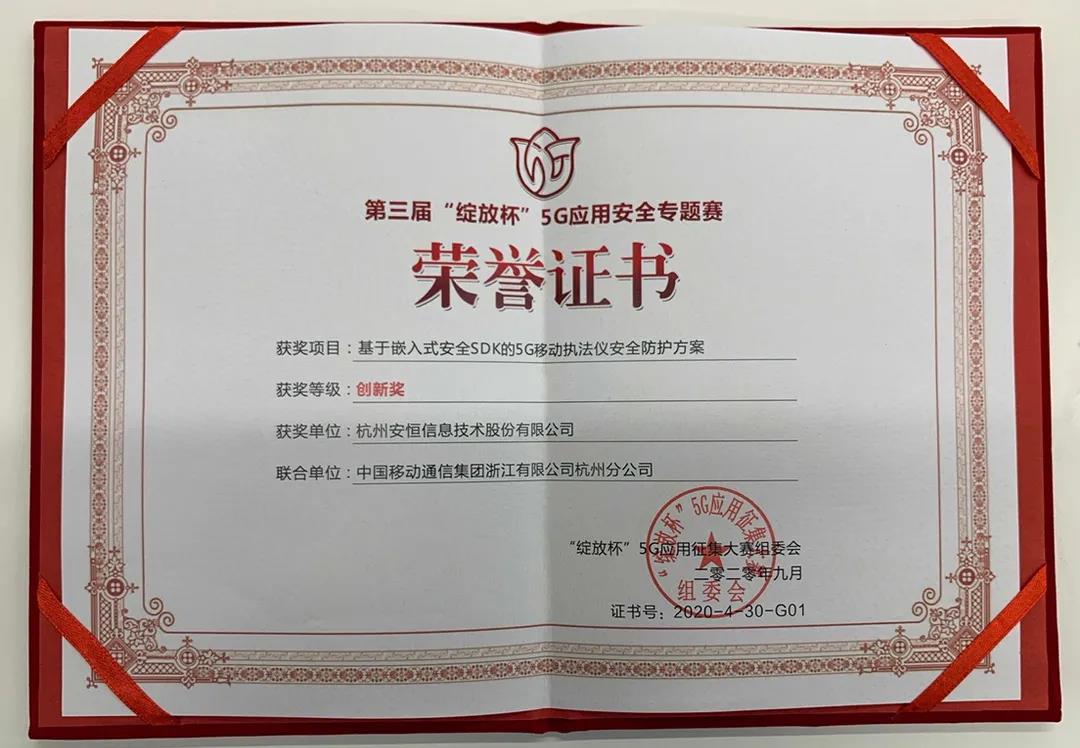 安恒信息参赛项目“基于嵌入式安全SDK的5G移动执法仪安全防护方案”荣获第三届“绽放杯”5G应用安全创新奖。