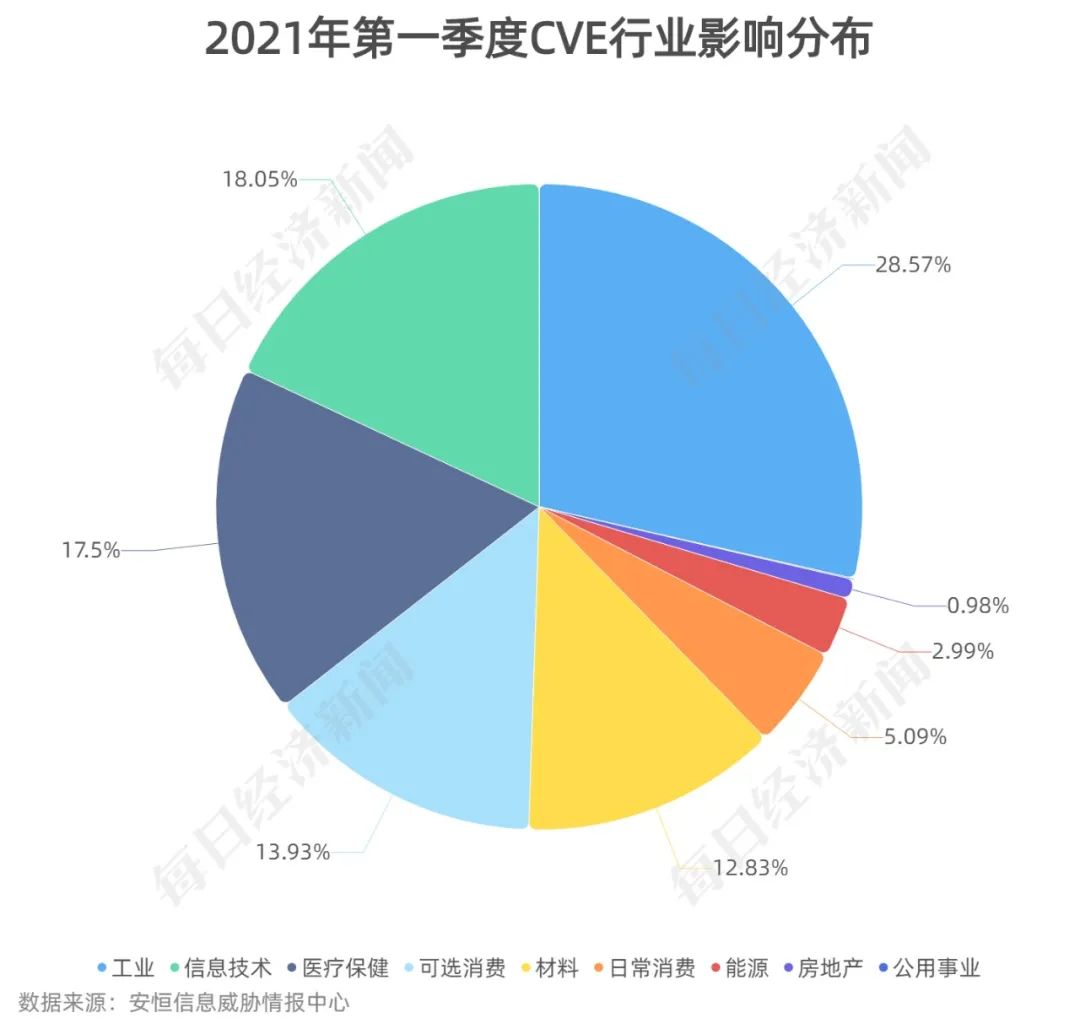 第一季度累计受到CVE安全漏洞影响的行业分布中,工业占比28.57%、信息技术占比18.05%、医疗保健行业占比17.5%、可选消费行业占比13.93%、材料行业占比12.83%,是受CVE影响最大的5个行业。