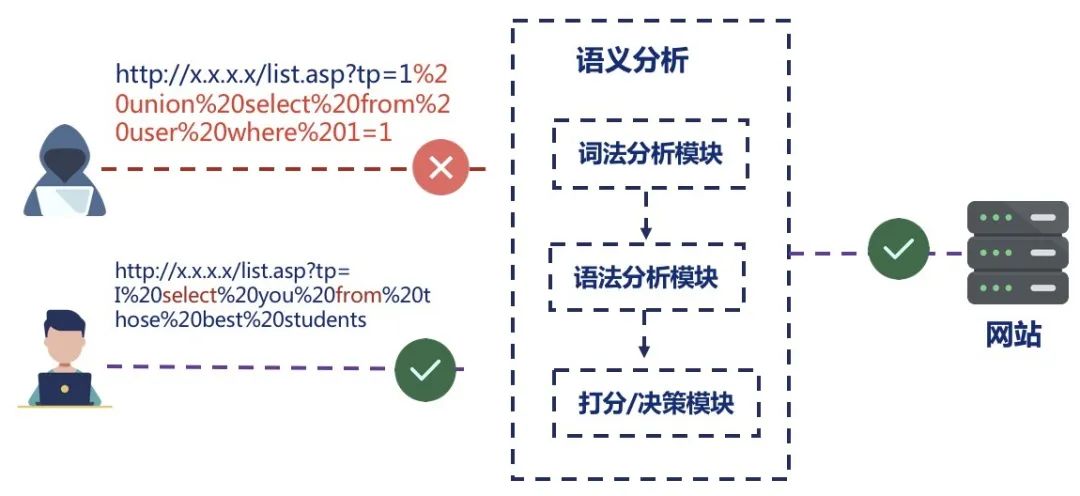 新一代智能WAF语义分析引擎采用智能识别、分析研判、综合评估相结合的方式,对攻击行为进行检测、防御,内置包括SQL注入、XSS、Webshell在内的13种语义语法检测类型。显著提高0day检出率,降低误报率、漏报率。