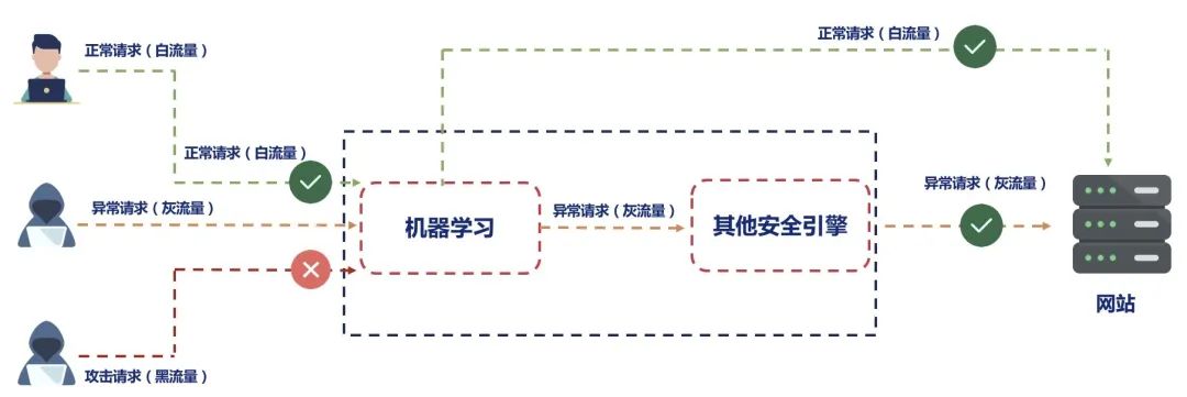 新一代智能WAF采用先进的机器学习算法模型,对Web业务系统建立正常的业务数据模型,并通过持续学习保持模型更新,实现对异常流量的检测,由机器学习自主完成已知攻击攻击检测和防御,并具备能感知未知威胁或误报漏报的能力,使用户脱离繁琐的规则维护工作。