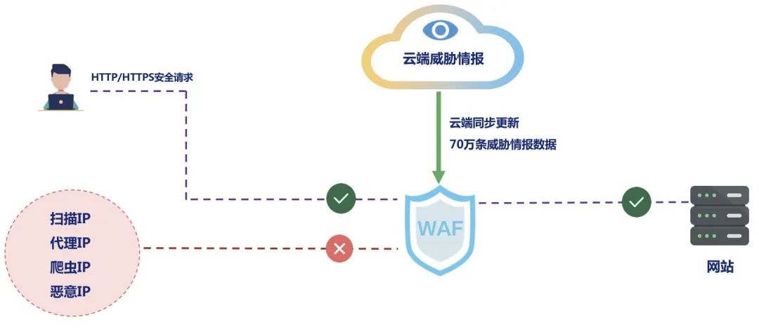 新一代智能WAF与云端威胁情报联动,威胁情报数据实时更新,主动发现可疑访问行为,快速检测僵尸IP、扫描IP、肉鸡IP等恶意IP等对业务系统的可疑访问行为。帮助客户快速定位潜在威胁。