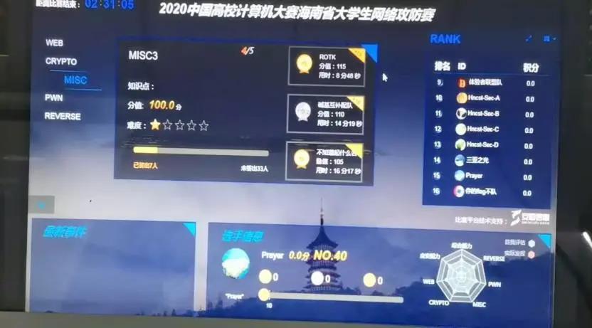 同时,基于安恒信息新一代明御攻防实验室平台,采用解题模式CTF赛制,参赛队伍集中现场网络参与攻防比拼,以解决网络安全技术挑战题目的分值和时间来排名。题目主要包含逆向、漏洞挖掘与利用、web渗透、密码、取证、隐写、安全编程等类别。