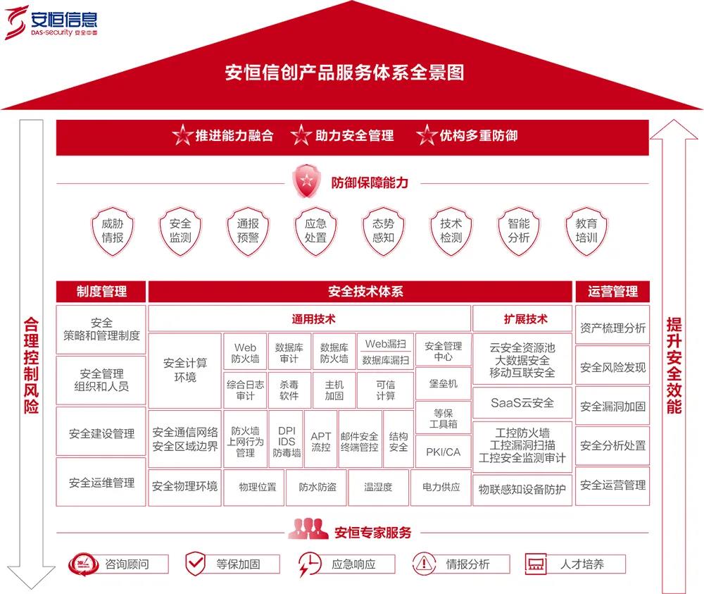 在已有信创产品和规划基础上,安恒信息推出信创整体解决方案。除基础安全产品外,在云计算、大数据和态势感知的安全领域都进行了深入研究并形成产品,配合安恒专家服务有效完善管理制度、运维制度推进与客户能力融合;同时通过威胁情报、通报预警、智能分析等防御保障能力,优构多重防御合理控制风险,提升安全效能,协助用户建设全面的安全体系。