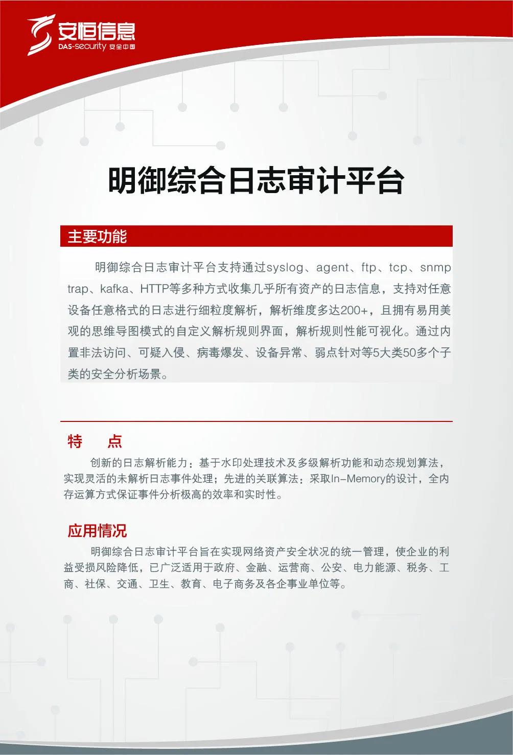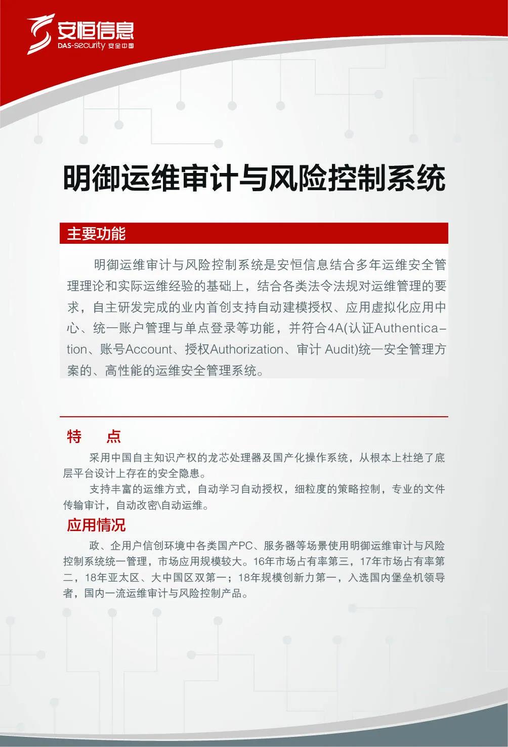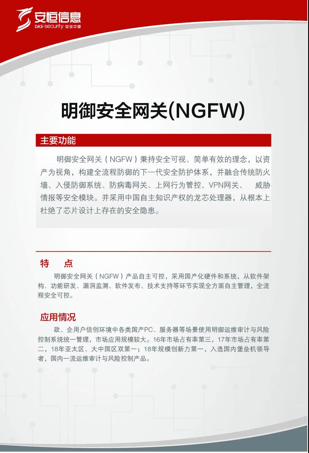 目前明御运维审计与风险控制系统、明御综合日志审计平台、明御主机安全及管理系统、明御安全网关、明御入侵防御系统等产品体系均已完成在龙芯硬件平台的兼容适配,同时已与龙芯中科技术有限公司融合网络安全解决方案。