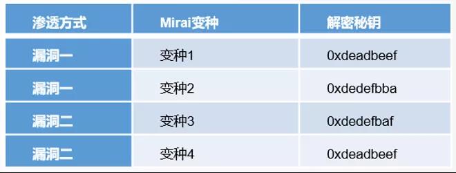 下面是4种Mirai变种的漏洞利用方式以及解密秘钥。