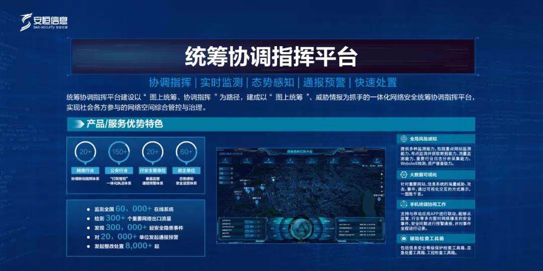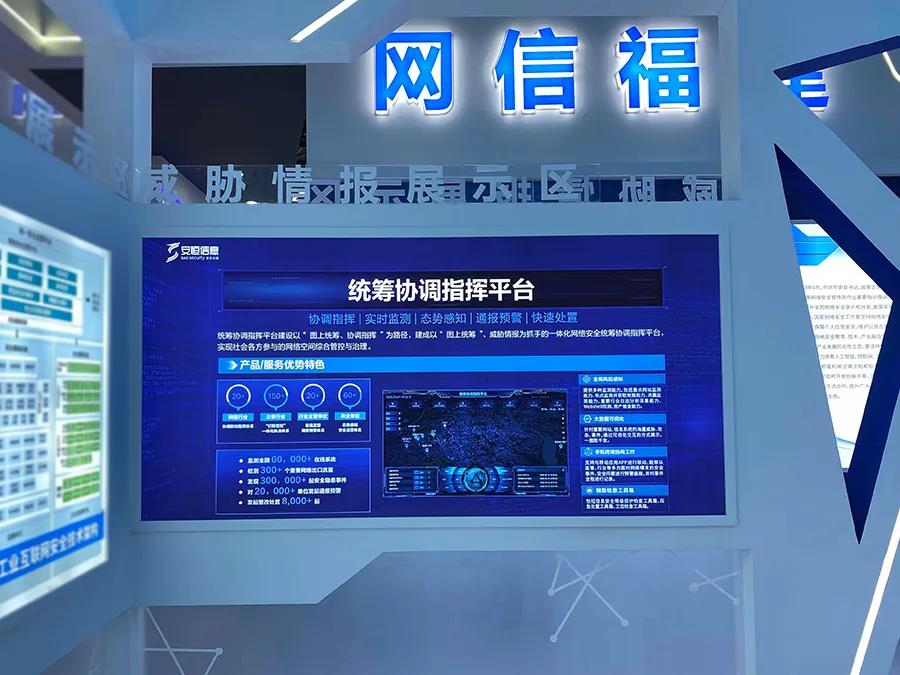 本次成果展,安恒信息在威胁情报展示区重点展示了统筹协调指挥平台。该平台建设以“图上统筹、协调指挥”为路径,建成以“图上统筹”、威胁情报为抓手的一体化网络安全统筹协调指挥平台,实现社会各方参与的网络空间综合管控与治理。