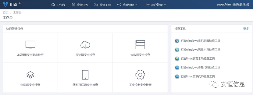功能升级:检查标准根据等保2.0规范全面升级,除支持通用要求检查外,新增面向云计算、大数据、物联网、移动互联、工业控制的扩展要求检查项,测评覆盖面更完整,结果更精确。