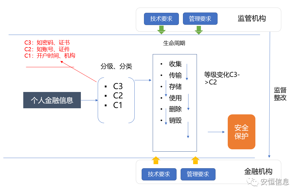 《规范》将个人金融信息按敏感程度、泄露后造成的危害程度,从高到低分为C3、C2、C1三个类别;同时,规定了个人金融信息在收集、传输、存储、使用、删除、销毁等生命周期各环节的安全防护要求,从安全技术和安全管理两个方面,对个人金融信息保护提出了规范性要求。