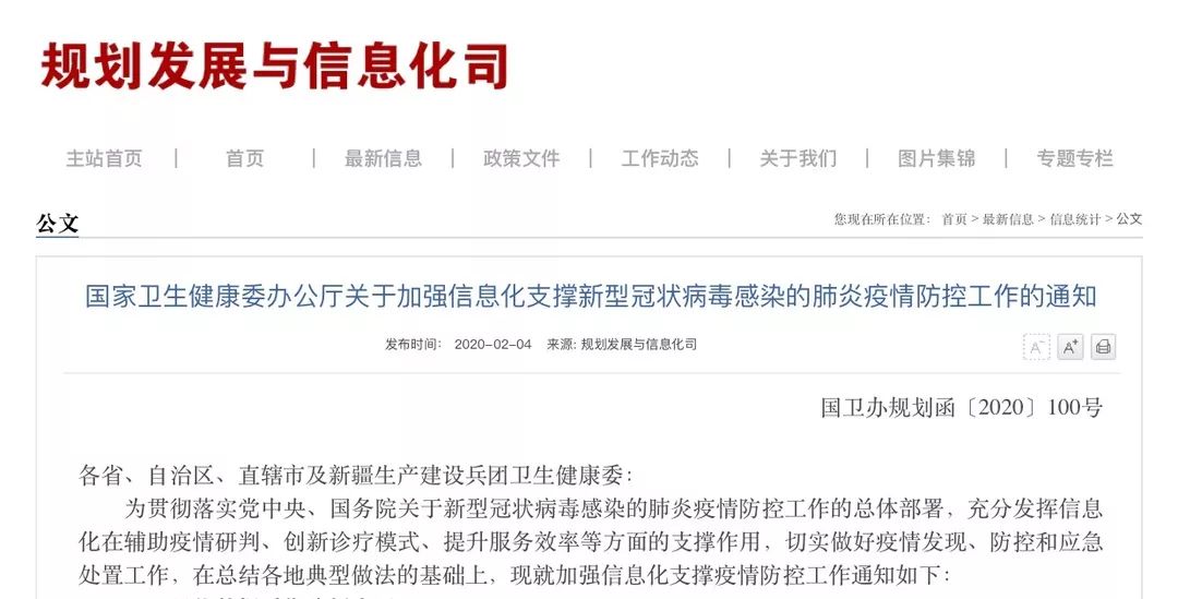日前,国家卫健委发布了《国家卫生健康委办公厅关于加强信息化支撑新型冠状病毒感染的肺炎疫情防控工作的通知》(以下简称“通知”),要求充分发挥信息化在辅助疫情研判、创新诊疗模式、提升服务效率等方面的支撑作用,切实做好疫情发现、防控和应急处置工作。
