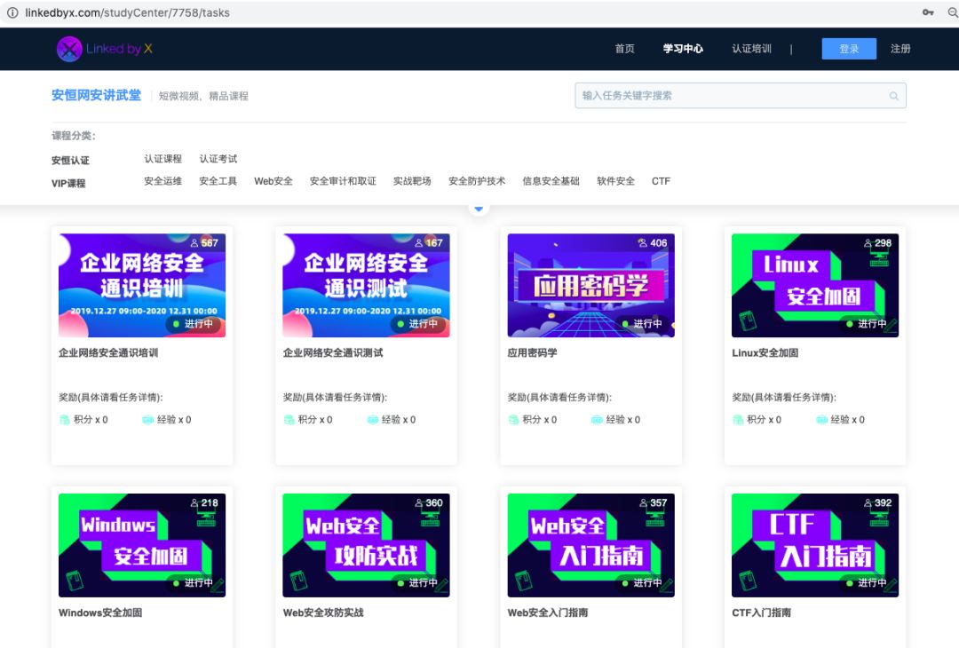 安恒自主研发与运营的互联网网络安全教育平台——LinkedbyX(X平台)支撑在线视频课程学习、理论考试和直播分享。