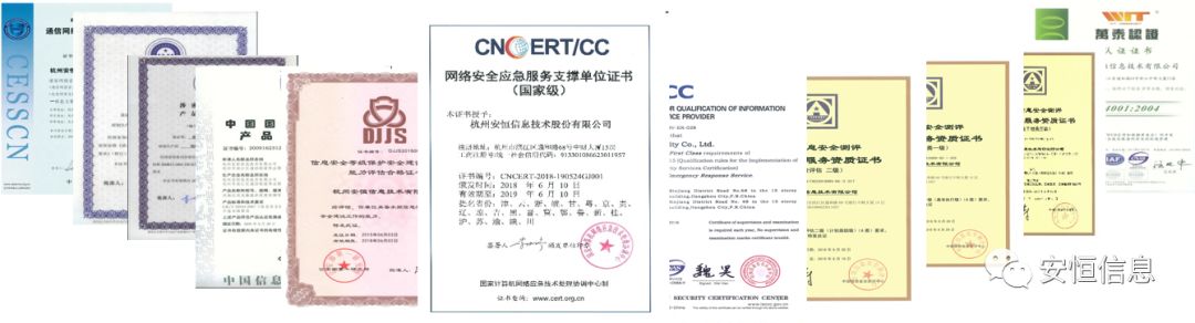 作为国家级核心网络安全技术支撑单位,安恒信息先后获得了安全工程、风险评估、应急响应等国家最高级的安全服务资质,具备很强的安全服务支撑能力。