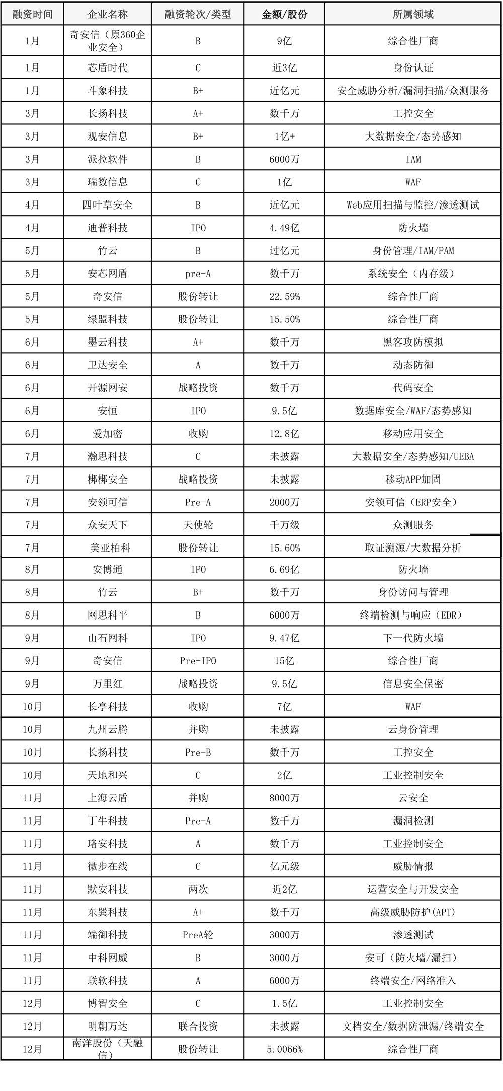 ✓2019年国内融资并购总金额达108.3亿人民币,创历史之最。其中,4家企业IPO(安恒信息、山石网科、安博通、迪普科技)30.15亿元。收并购金额23.60亿元,投融资金额54.55亿元。