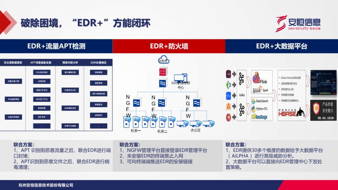 在用户网络环境中,存在海量端点。EDR与APT流量检测类产品联合,如同由点连线;与防火墙产品联合进行终端安全管理,如同由线及面;与大数据平台联合进行高级威胁分析,如同立体的堡垒。与多款产品相结合,帮助用户进行立体化网络安全防护。