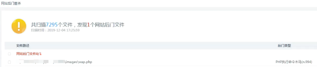 用户反馈已清除木马,但根据日志看到当天上午还有PHP后门被创建。通过网页防篡改系统的网站后门查杀功能扫描后,看到果然有新的后门。
