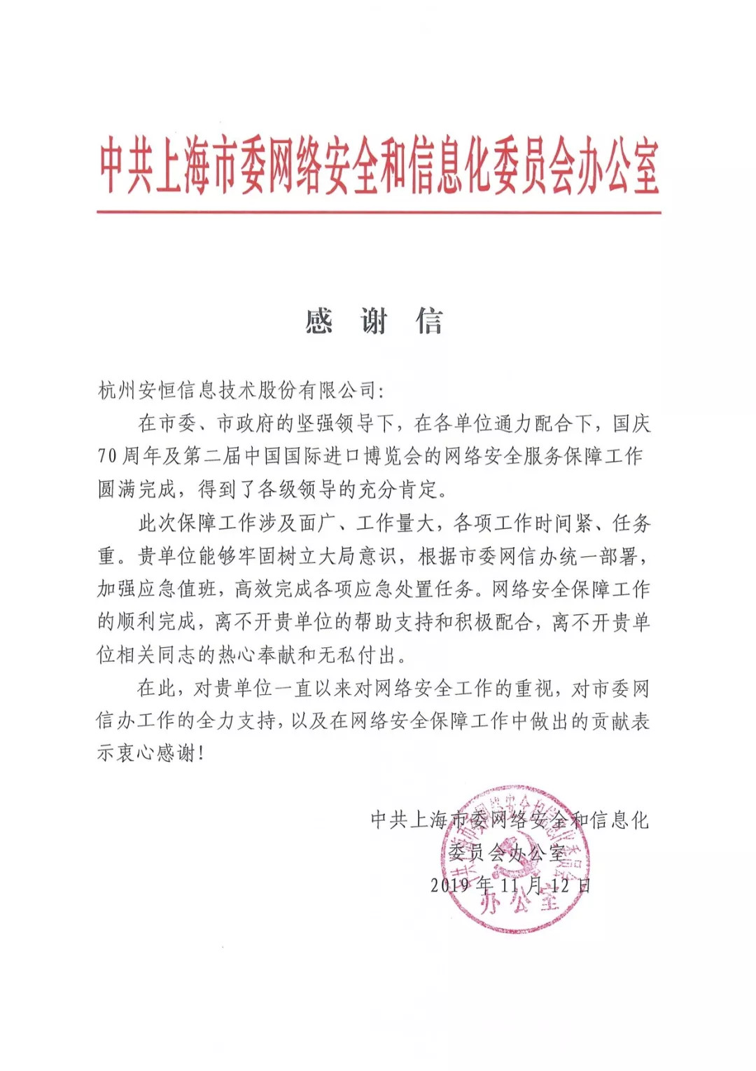 汝之认可,吾之动力。截至目前,安恒信息已圆满完成了G20峰会、上合峰会、世界互联网大会、建国70周年、第二届全国青年运动会、第七届军人运动会等重大活动的安保工作。丰厚的感谢信,体现了各界对安恒信息网络安保能力的认可以及责任至上工作态度的肯定。未来,安恒信息将继续秉持开放创新的态度,专注网络安全领域,为中国数字化进程持续保驾护航。