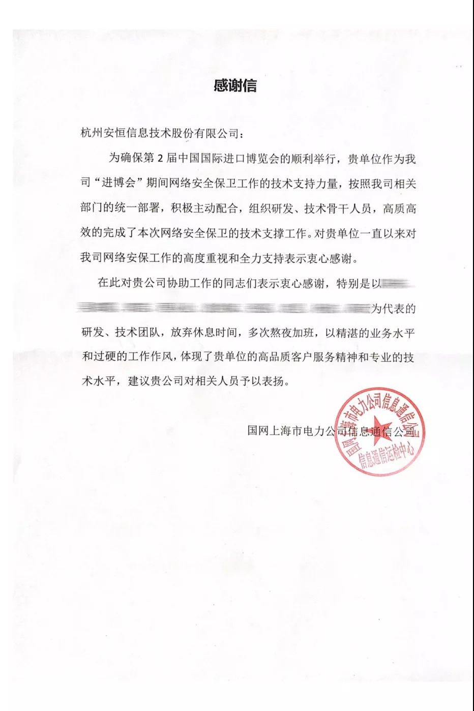 近日,我们收到这些感谢信,它们来自”中国国际进口博览局、中共上海市委网络安全和信息化委员会办公室、上海市公安局智慧公安建设领导小组办公室、浦东分局网络安全保卫支队、闵行区进博会网络安全工作组、国家会展中心(上海)、国网上海市电力公司信息通信公司......“